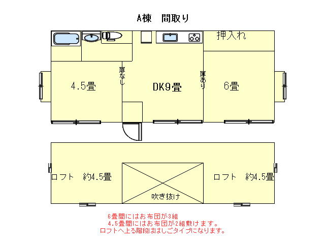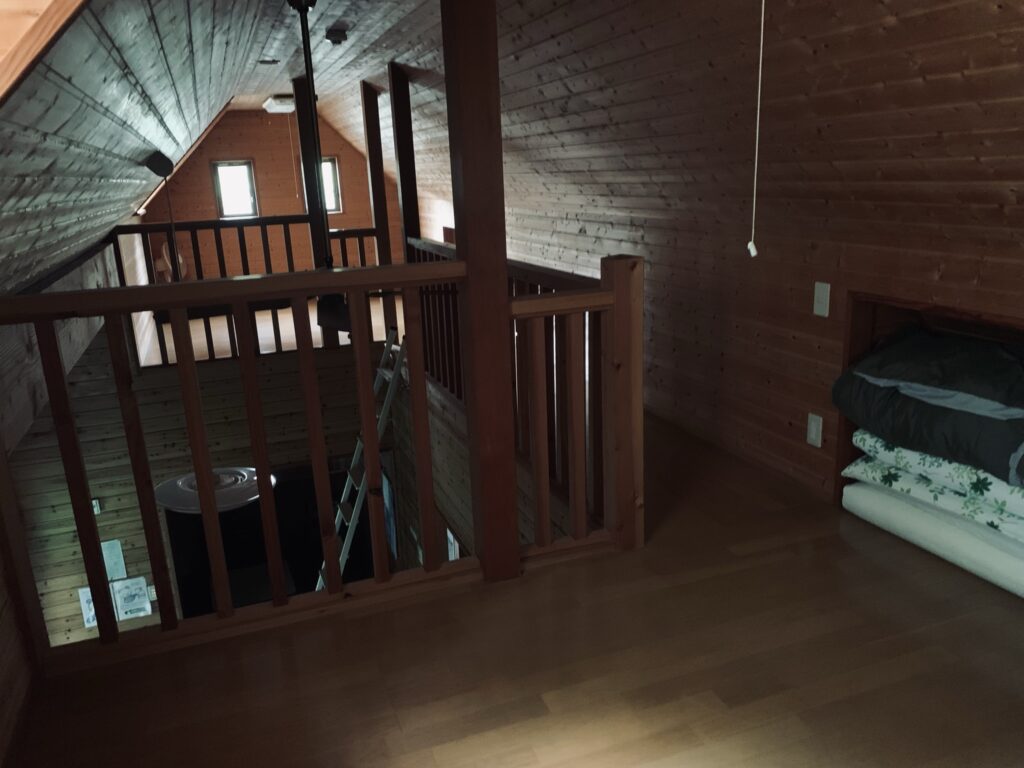 ロフトに上るのははしごです。ちょとだけ上るのに注意が必要です。 ロフト部分は4.5畳×2か所です。B棟より狭いですが、秘密基地のような雰囲気です。ロフト天井少し低いです。