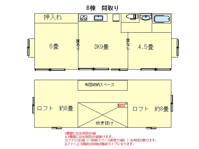 B棟はロフトに上るのは収納式はしごです。必要ない時はたたんでおけます。小さいお子様が危ないと感じる時は収納してしまえば安心です。 B棟のロフトは広く8畳×2か所 となっております。