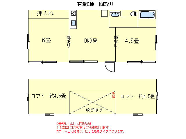 外観もAB棟とは異なります。all木造の外観内装ではありません。一般住宅と同じような造りです。3棟の中で一番古い建物ですが、内部も外観もとてもきれいです。間取りはA棟とほぼ同じです。
